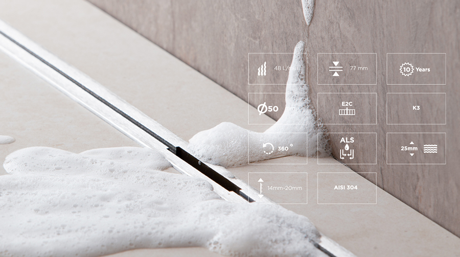 防滲漏: 由于支撐格柵的全新設(shè)計(jì)和瓷磚下泄露所有的冷凝水發(fā)現(xiàn)其放回排水方式。通過附帶的產(chǎn)品自粘防水膠帶補(bǔ)充。