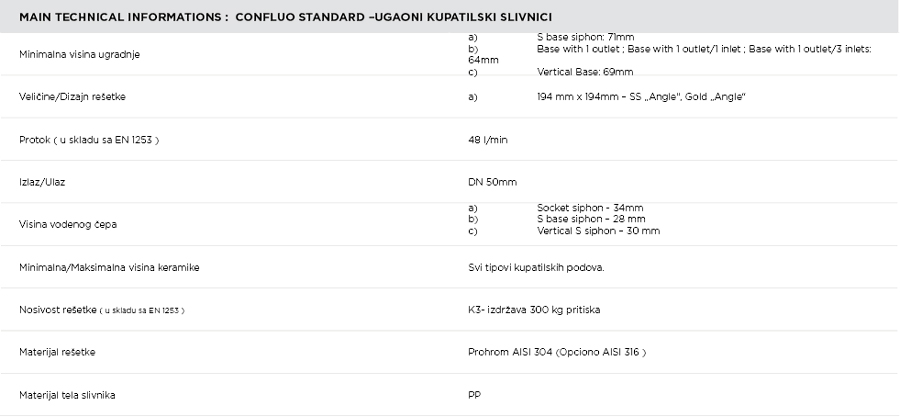 Peštan公司其Confluo標(biāo)準(zhǔn) - 在1種尺寸(194 X194毫米),2種不同的網(wǎng)格設(shè)計(不銹鋼“角度”黃金“角度”),4個不同的堿基(水平,帶1個輸出的基礎(chǔ)上,其基極產(chǎn)生的角浴室地漏是水40毫米的止動件,其基極為30mm與水性塞子,垂直基)和2種不同的模式虹吸(在虹吸就是DB,所述杯形密封件)。所有基地Confluo標(biāo)準(zhǔn)模型具有DN與高達(dá)48升/分鐘的流量輸出50毫米。從74毫米最低高度毫米到95毫米視型號而定。